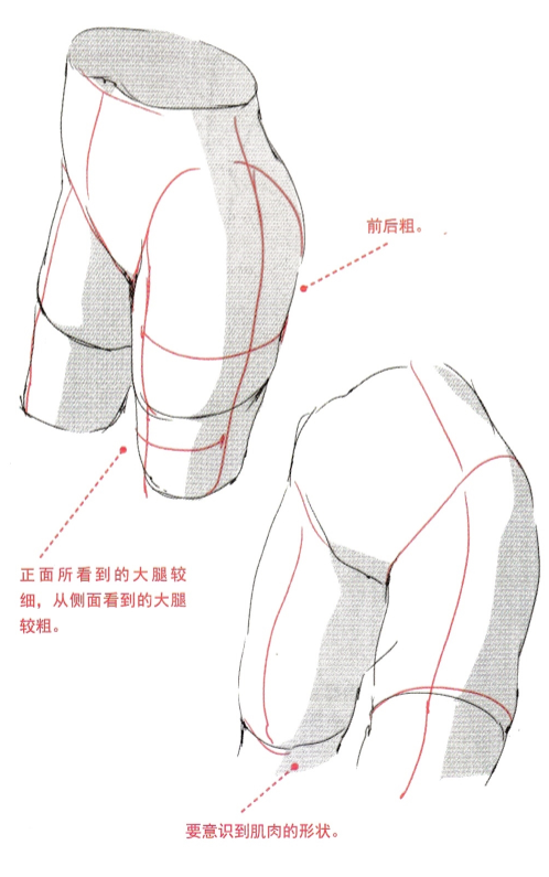 大腿左右与前后的宽度不同,左右较细而前后更粗。此外大腿上粗下细呈倒三角形,这些只要观察一下自己的腿部便可明白。这一倒三角形,从前方观察时会显得较为纤细。