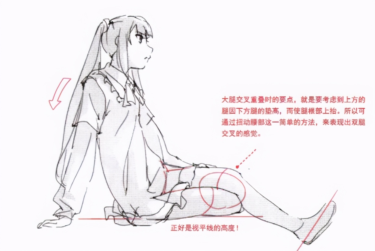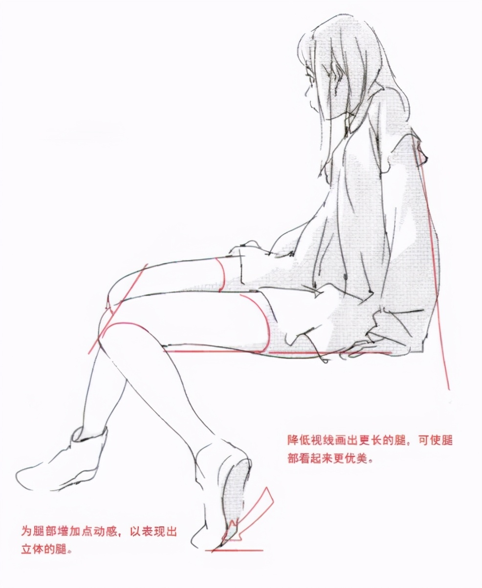 接着再来总结一下坐下时大腿的挤压变形,以及不同姿势下大腿形状的变化。这也是关系到能否表现出大腿魅力的方法,所以希望大家能够牢记。