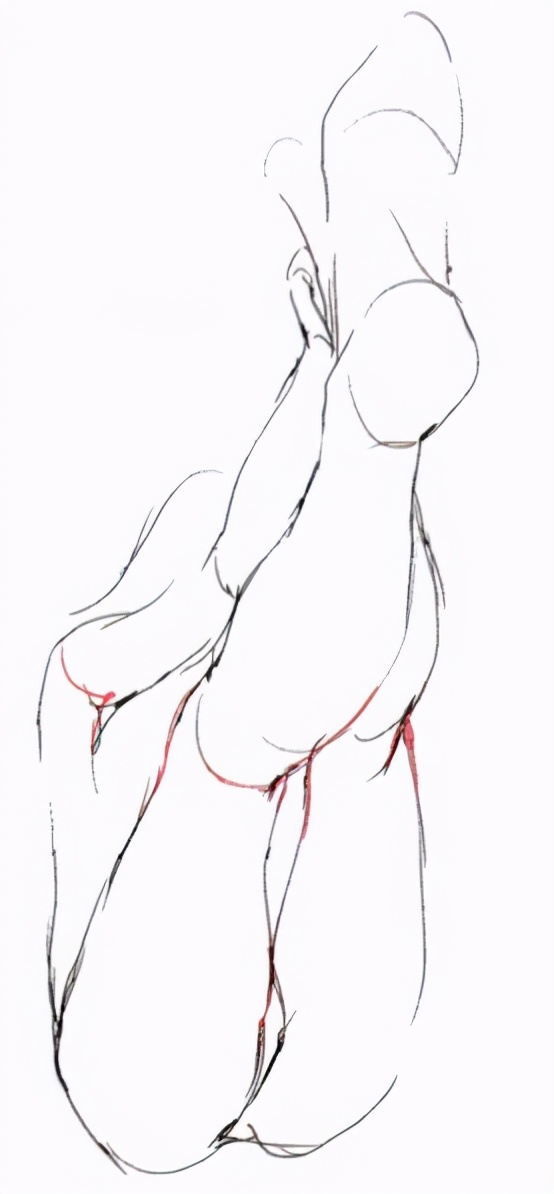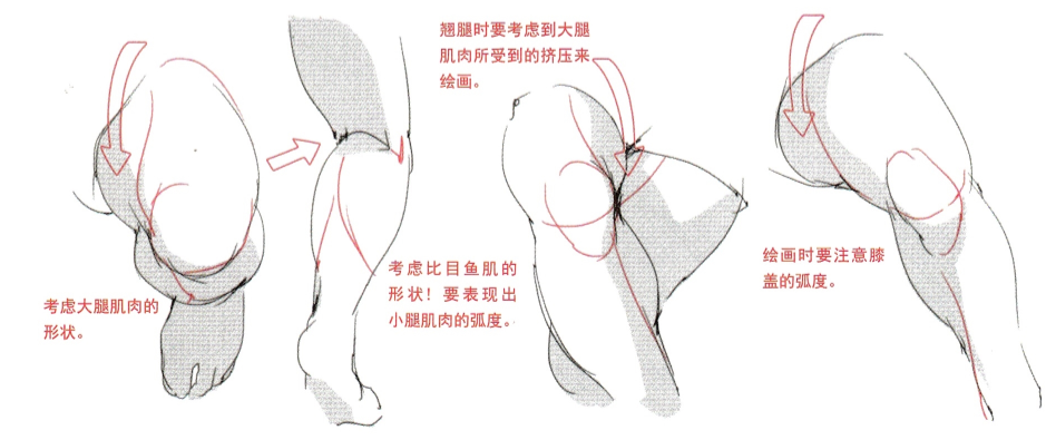 与站立时相比,大腿的宽度有些增加,小腿肚的弧度也更加明显。绘制时要注意大腿与小腿部分的角度变化。
