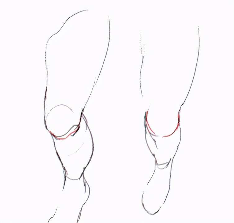 同样,膝部大幅弯曲时也必须要考虑着大腿与小腿的重叠挤压变形程度来绘画。绘制时还要多想一想,伸直腿部时的膝盖与跪地时膝盖的形状差异。