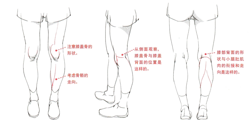 要考虑着膝盖骨、腿部骨骼与肌肉来绘制线条。要点是要注意膝部的形状与厚度。