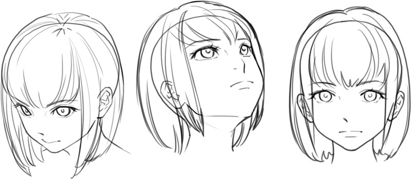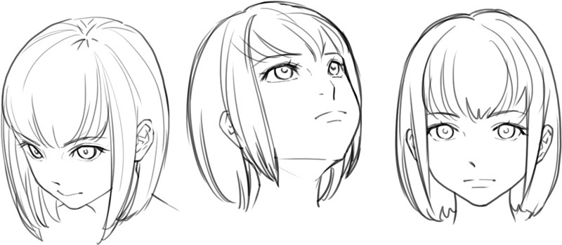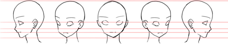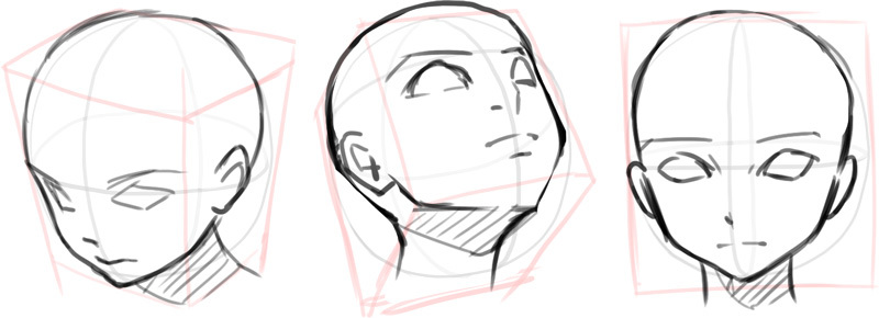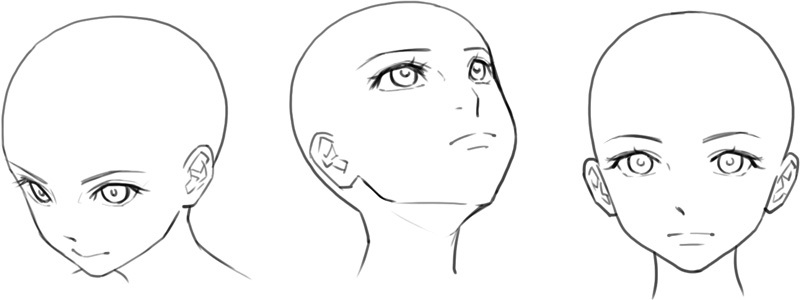 注意眼睛,鼻子,嘴巴和耳朵的位置。在这里,很容易理解,我是从身体状态(没有头发)中提取的。请注意,当您向下看时,额头会变大,而当您向上看时,颚会变大。
