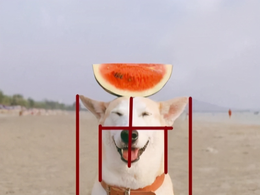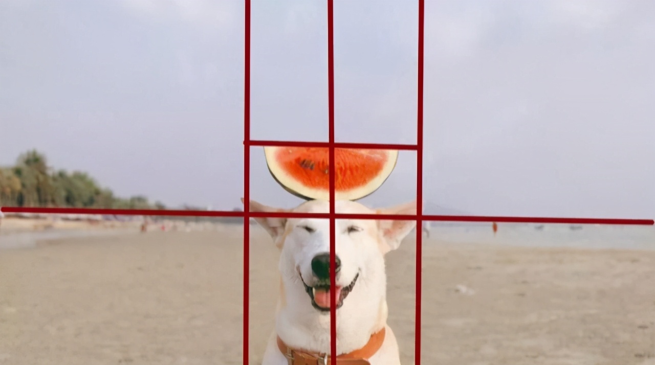 狗和西瓜在画面的正中间,海平线正好将画面上下一分为二。