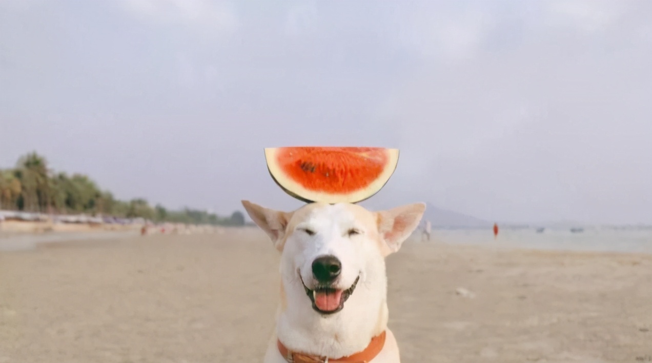 我们可以看到了狗、西瓜、沙滩、天空。