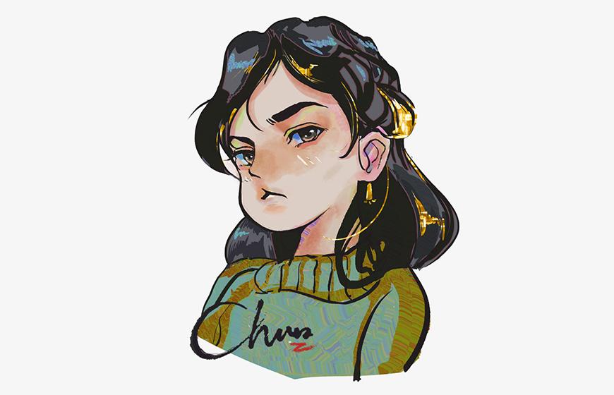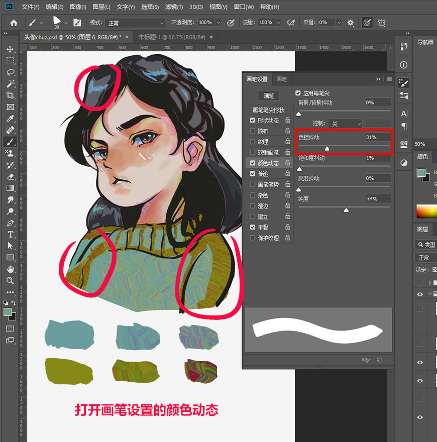接下来给毛衣画细节,毛衣上的色彩和头发的高光一样有一些色彩波动,这里用到了颜色动态里的色相抖动(打开画笔设置—颜色动态-色相抖动)这里数值越大,抖动效果越辣眼睛,所以根据需要自行调数值就好了,增加一些伪细节。