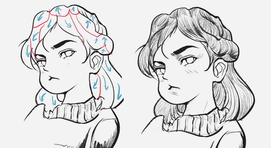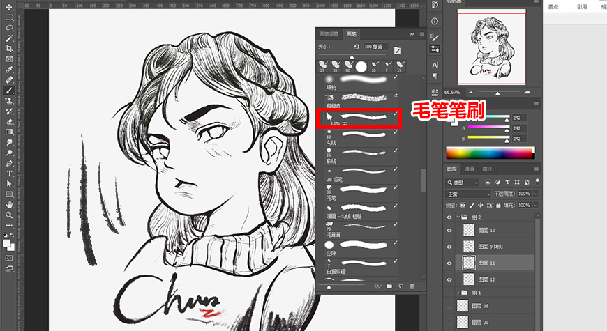轮廓线搞定进行头发分层,这种块状区分可以清晰分出头发走向,使头发更蓬松有层次。将笔刷调小一点按照走向排线,排出疏密关系,duangduang加上logo,黑白头像至此就完成啦。(logo和带毛边的线可以选取这种毛笔笔刷,网上搜有很多)