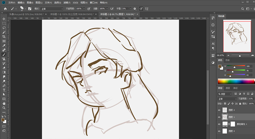 Q版大头最突出的是发型和面部表情,选取一个辨识度高的发型作为参考(这里画的是自己头像用的是照片,如果是原创和同人头像,就加强一下人物发型特征。)选取一个带压感的笔刷画一下大致轮廓。