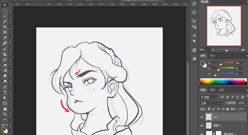 再降低上一层线稿的不透明度,新建图层细化,边界可以加粗显得更有层次,顺便修改面部的圆润度,为了表现出一点傲娇的属性,眉头部分可以往下压一点(轻微皱眉)。