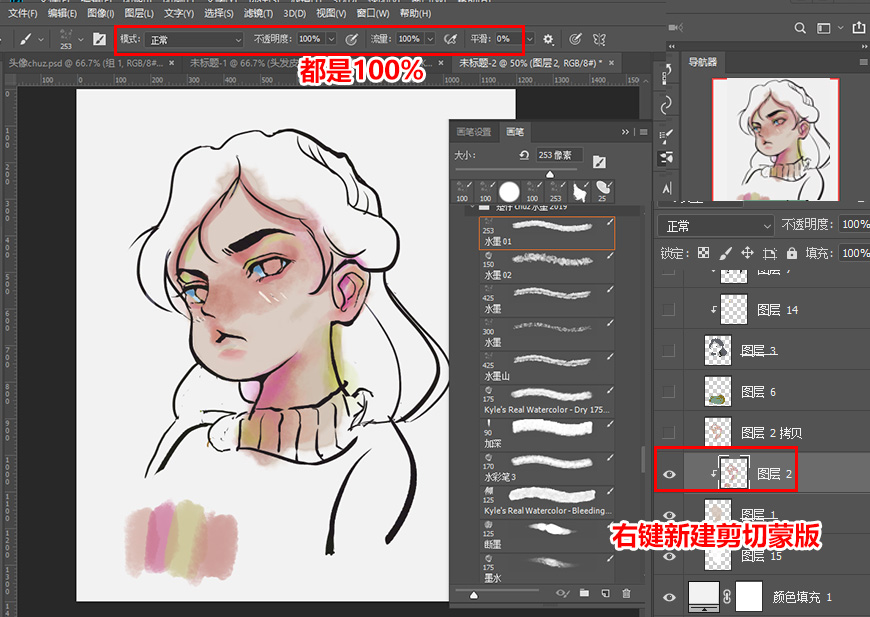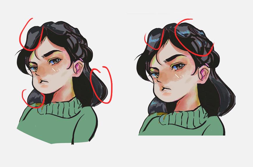 先来画脸,可以把头发衣服图层隐藏,在皮肤图层上新建一个剪切蒙版,这样不会涂出超出皮肤的区域(不过这里的头发图层在整个皮肤上面,涂出去影响也不大,后面会被头发图层遮住。)用这种边缘柔和的笔刷将不透明度和流量都调至100%,根据面部素描情况来绘制。眼窝和眉部区域深下去,亮的部分用偏黄的颜色点亮。(会化妆的小伙伴可以按照眼影的画法给眼睛进行上色,原理都是一样的,两边深中间浅突出眼球体积感。)脖子和脸部的交界用偏紫的颜色加深区分,耳蜗里也打上一点偏紫的阴影。