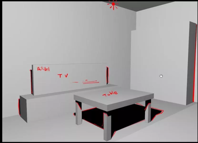 类似台灯的光,从一个点出来的光投影是比较锐利的。如果光比较远,物体的投影会很模糊,类似散射光,越来越散就会变成阴天光,阴天光的投影会在物体的下面。