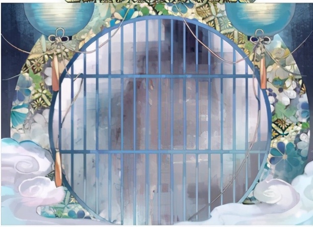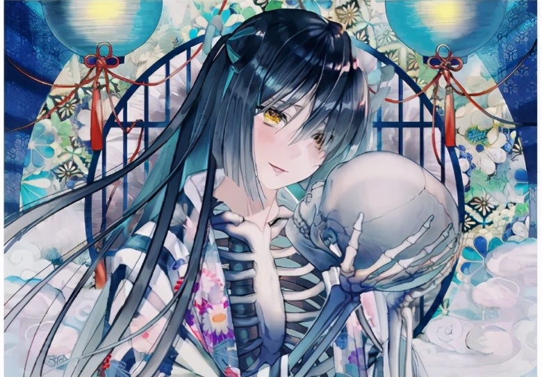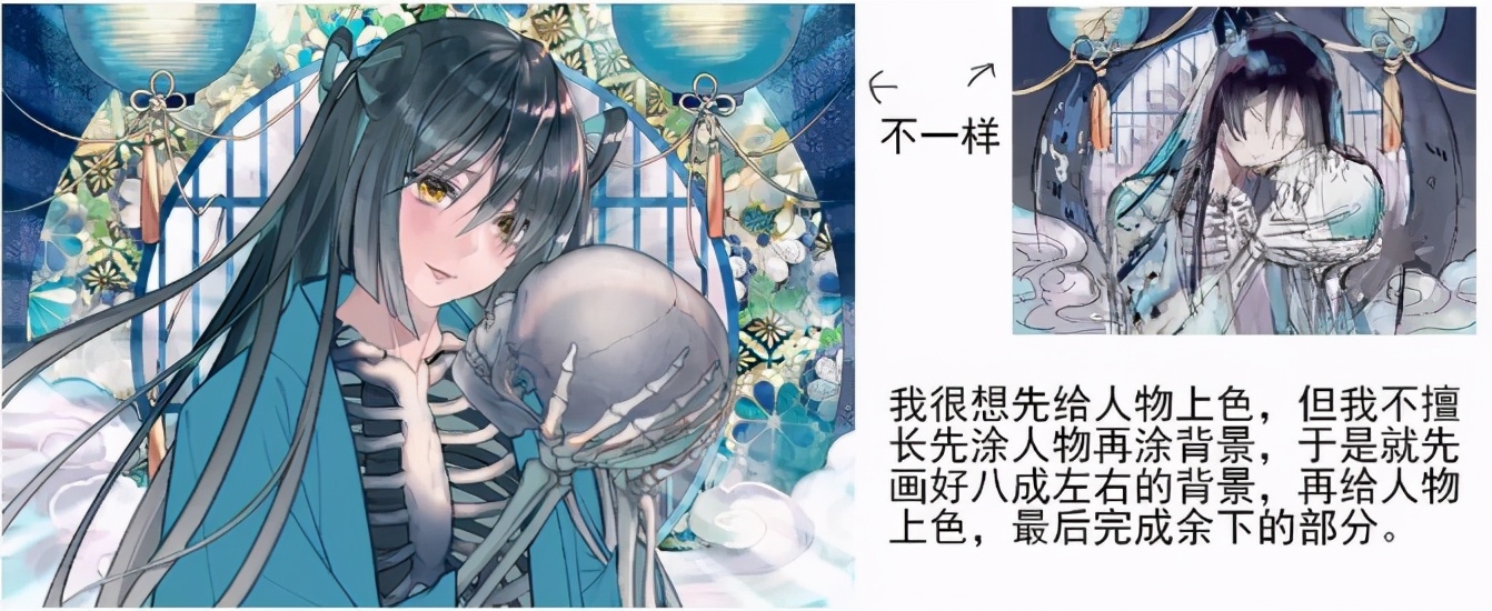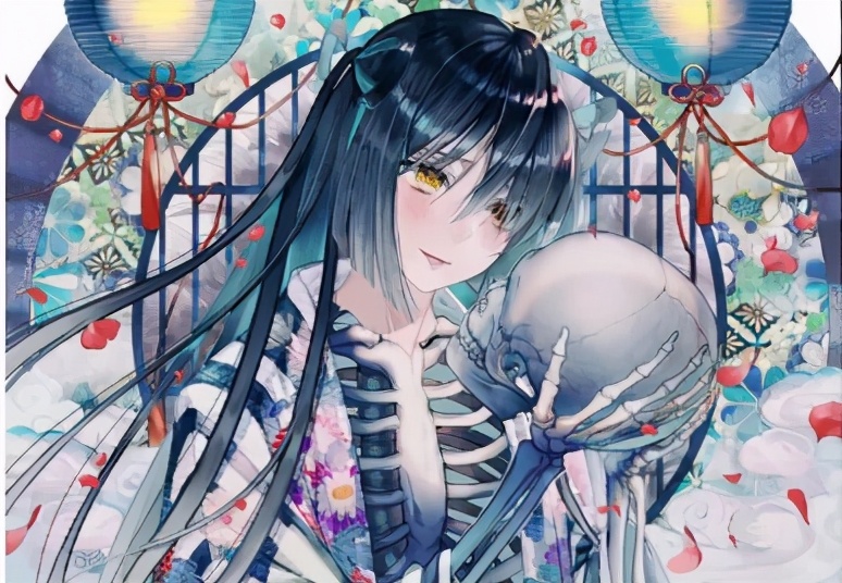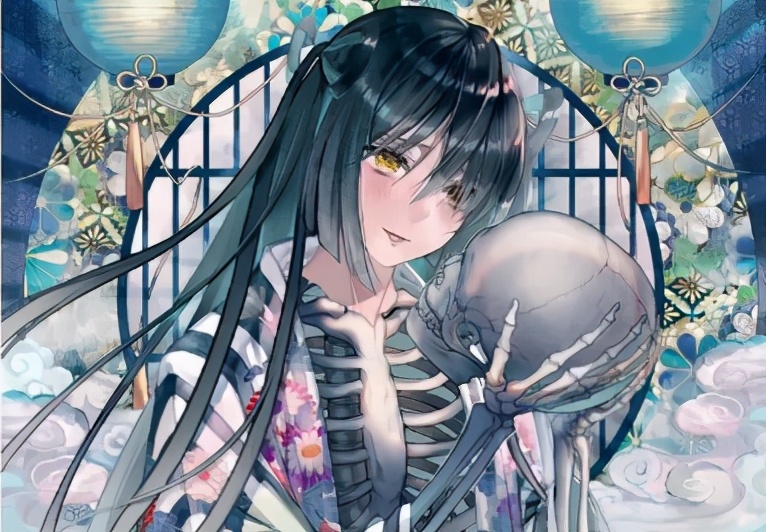 采用向心式构图,并且将角色放在正三角形里。这是一种比较稳妥的构图手法,不会出现失误,但也显得比较普通。在中间画个圆后就有日式的感觉了(很简单)用灯笼、头部和骷髅构成了-一个倒三角形。我这么做只是想让构图有一些特色,但并不清楚是否有意义。