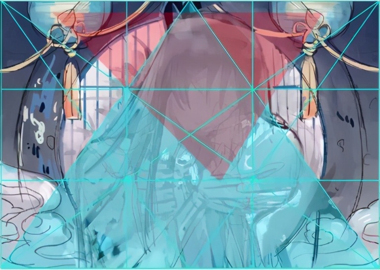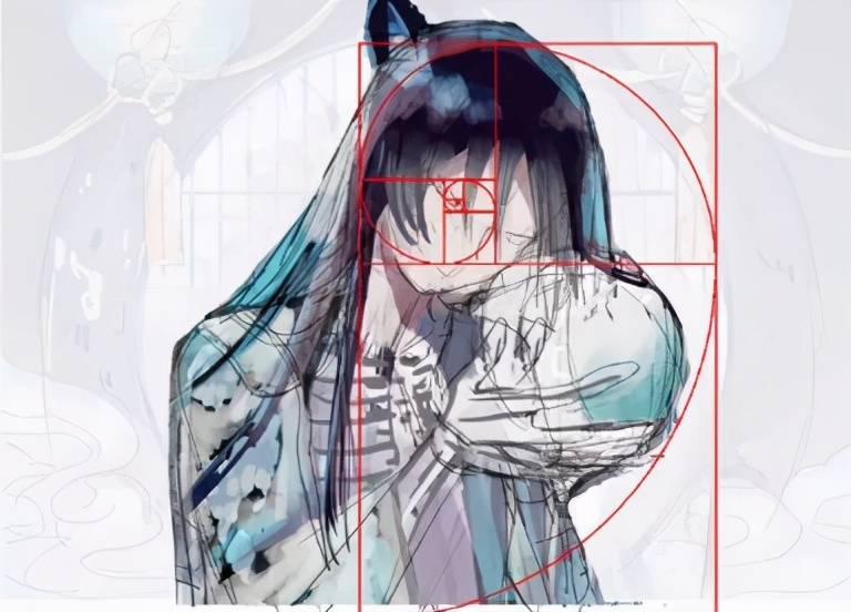 人物的头发和背景里的窗户符合黄金比例。调整人物草稿,使黄金比例的中心落在人物的眼睛上。