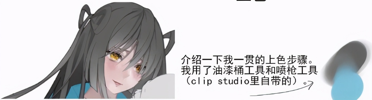 介绍一下我一贯的上色步骤。我用了油漆桶工具和喷枪工具(clip studio里自带的)