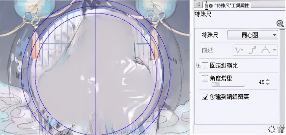 用特殊尺里的工具创建同心圆,调整圆的位置,使其与窗户相吻合。此时画笔会吸附于特殊尺作画。