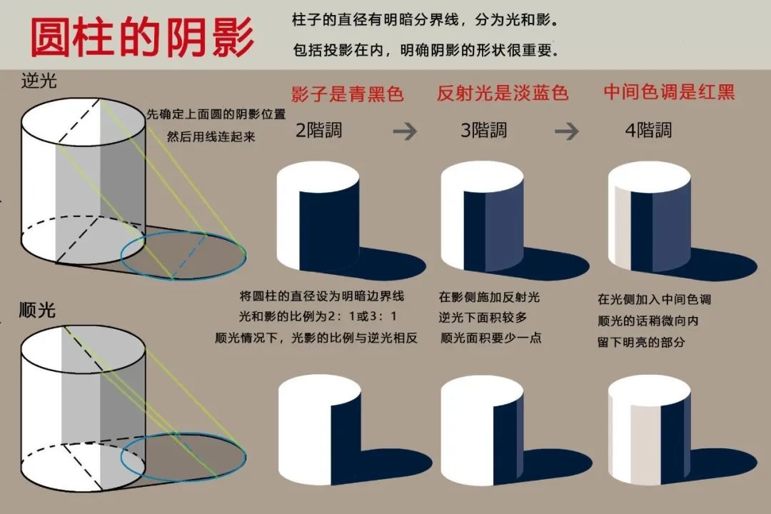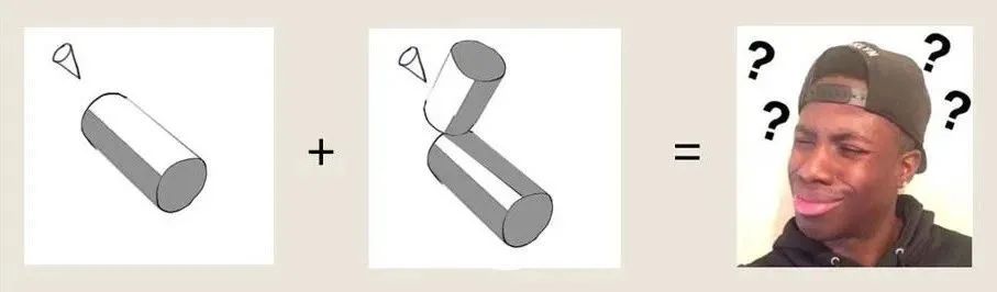 一束光打在圆柱体上,我们能轻松画正确第一种情况,但一旦遇到多个几何体叠加起来(第二种情况),我们就很容易出错。