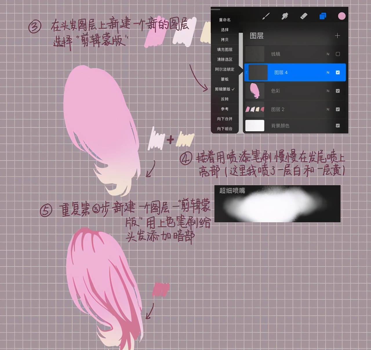 4、接着用喷漆笔刷慢慢在发尾部位喷上亮部(这里我喷了一层白色和黄色)