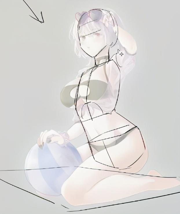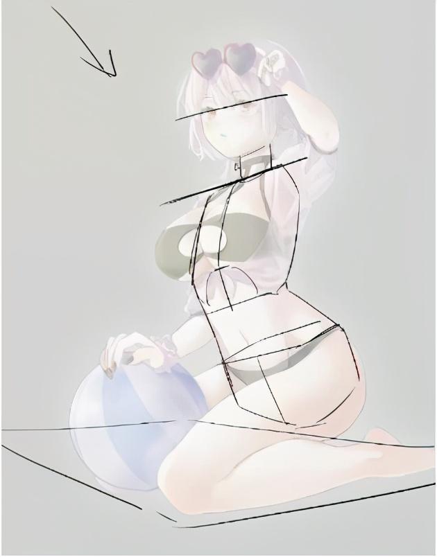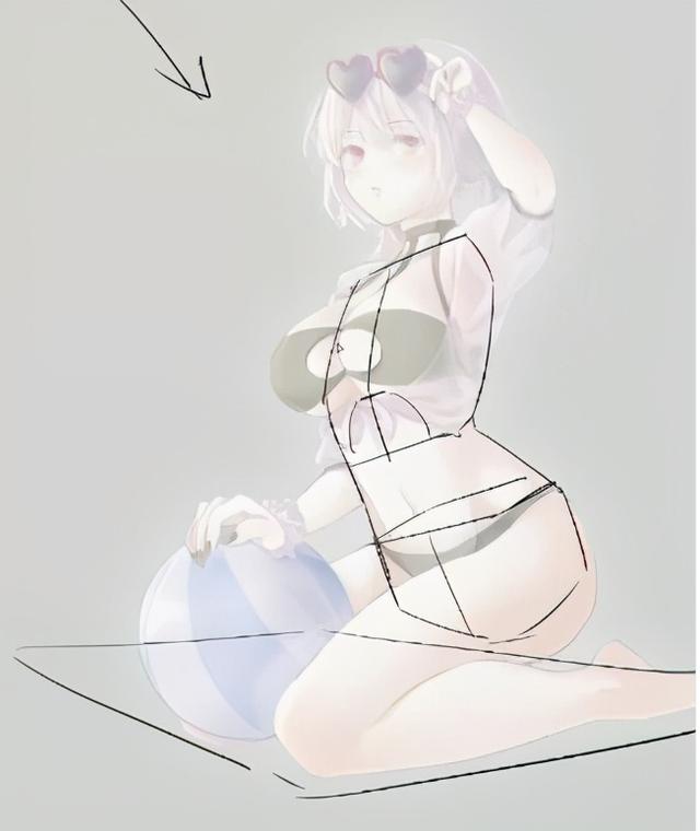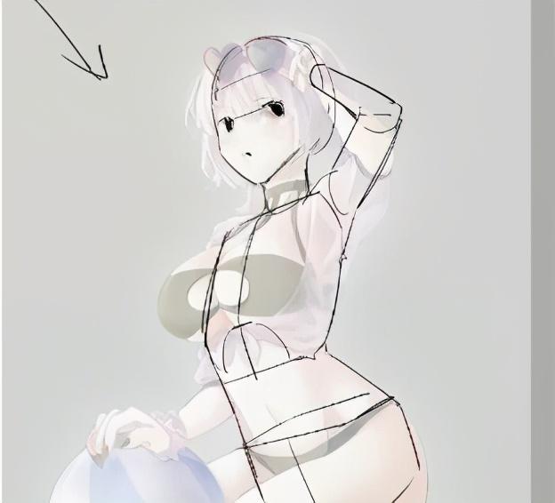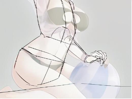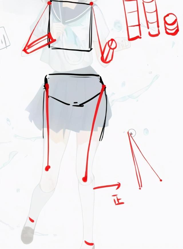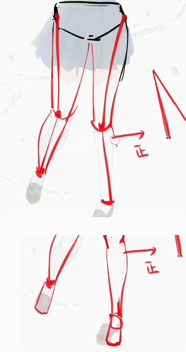 3、把人体结构标出来分析一下,我们会发现腿是有问题的,大腿部分过于长了,要改动一下,然后是脚的角度扭得有些厉害,感觉不自然。