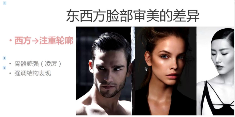1、脸部审美。东西方脸部审美的差异。西方注重轮廓,骨骼感强(凌厉),强调结构表现。