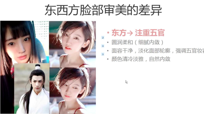 东方注重五官,圆润柔和(细腻内敛),面容干净,淡化面部轮廓,强调五官妆容。颜色清冷淡雅,自然内敛。