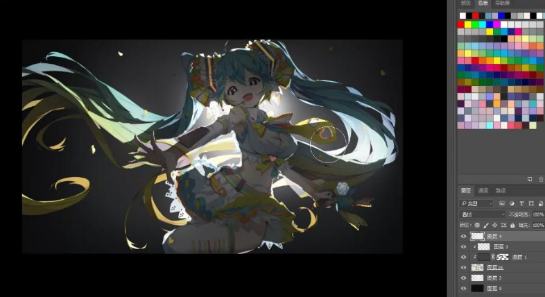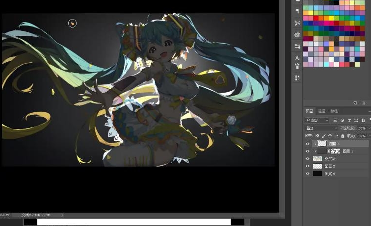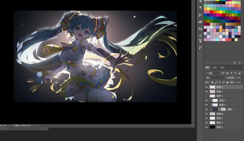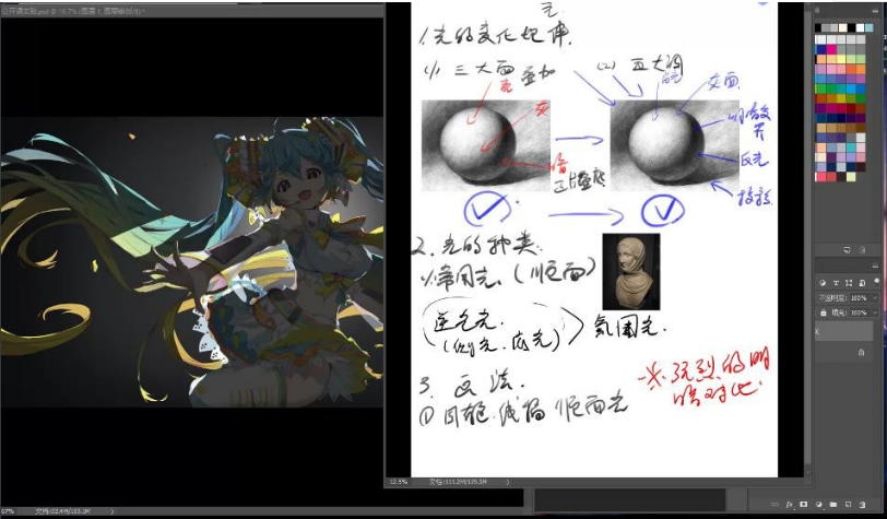 2、不同的光源烘托的氛围效果也会不同。如老师的初音图,顺光的话,正片叠底,画角色的受光方向影响的暗面和投影面,画出上图的大概的感觉的,还有老师最喜欢的逆光。