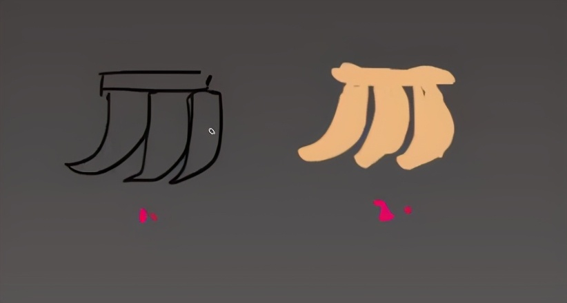 下例中的香蕉。线稿无法直接表现到造型,在线稿的阶段很难判断造型。线加上剪影会比较直观一点。