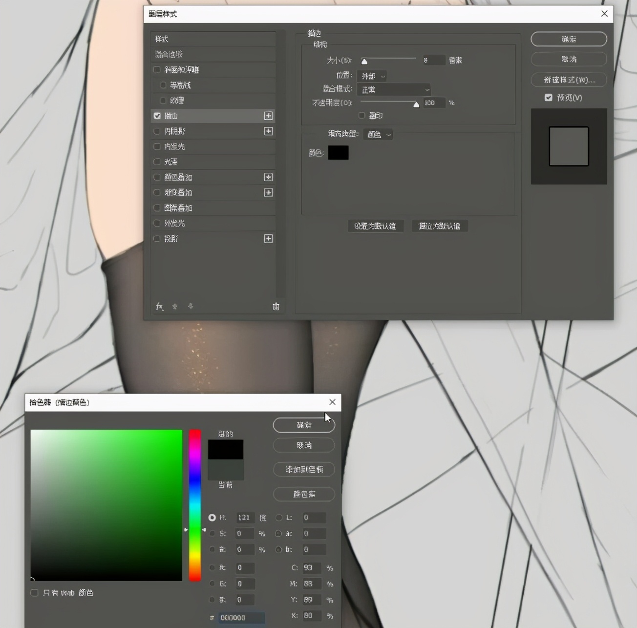 用图层描边,然后用笔刷画吊带袜的边,然后画出腿和屁股的肉感。