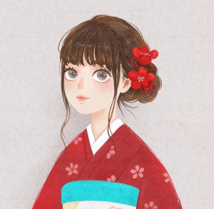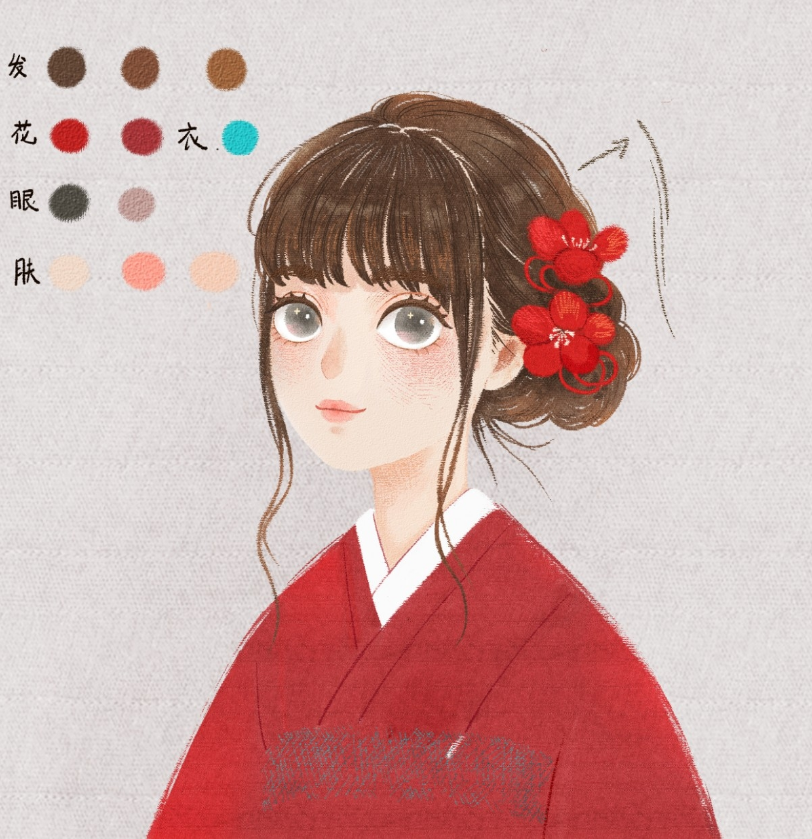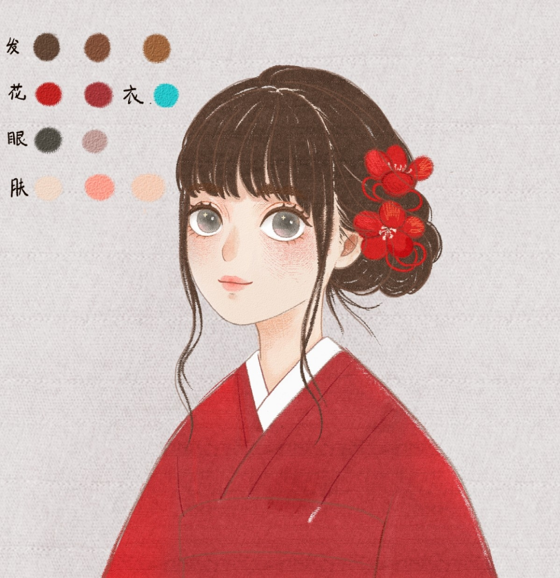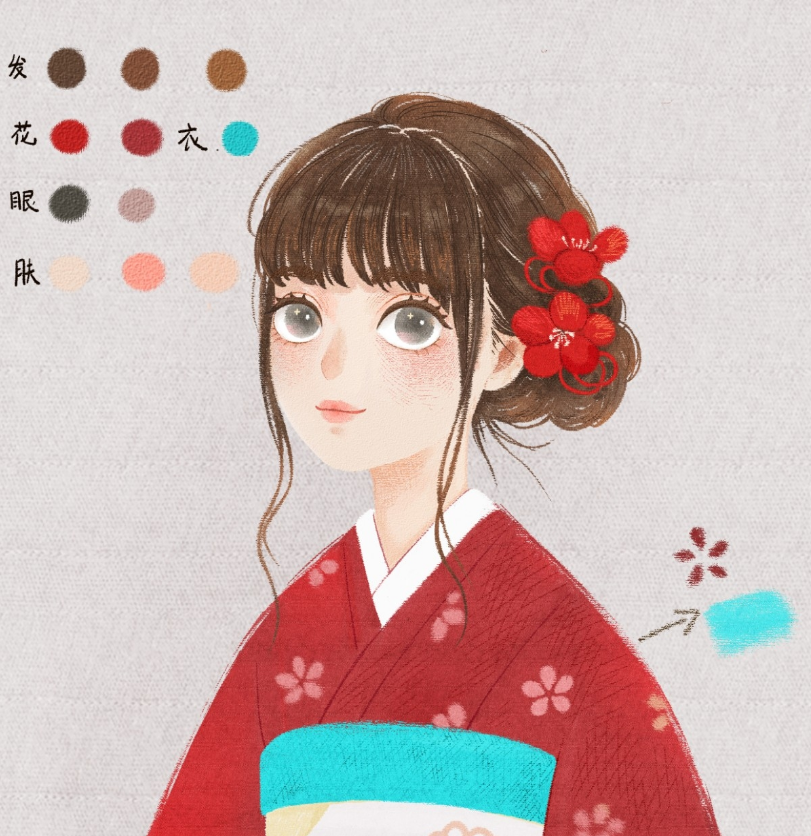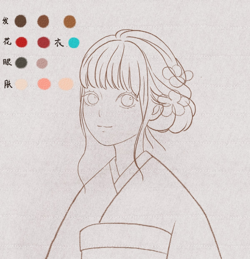 加上和服上的小花以及撞色腰封的绘制,我在画布上也有单独列出来,注意下笔的透气性,即不需要把和服的底色彻底盖住,让颜色稍微透出来一点,但要当心颜色的选择以免透出来的颜色显得脏兮兮的。由于之前在腰封处画了很多交叉的细线,这里直接平铺就会出现铅笔手绘粗糙的质感。衣服上画出体现布料的交叉斜线,就基本完成了。