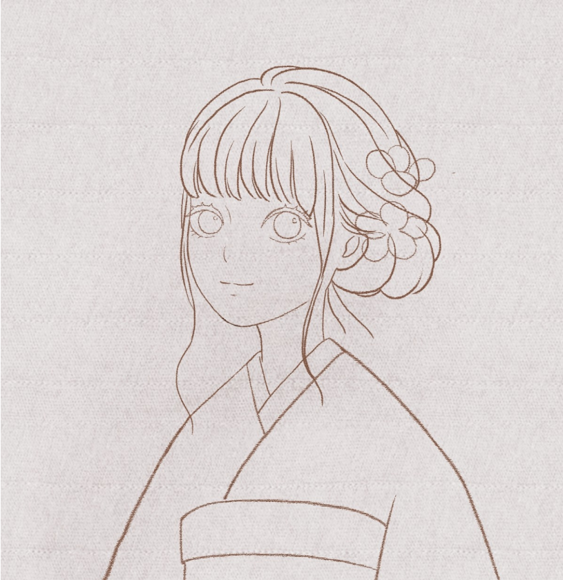 先用铅笔把基本颜色在线稿范围里填上,边缘可以随意一点,不需要画的很精细,保留手作的质感。和服用花的两个颜色混合在一起上色,让和服有一种手绘用的水溶性彩铅大面积铺色色彩不均匀的感觉,并用一个深红色勾勒出领口的线条。顺着头发丝的方向铺上头发的底色,不需要把头发完全涂实。用铅笔笔刷画一些如图中示例的长线条来表现散落出来的发丝,注意线条要自然流畅。