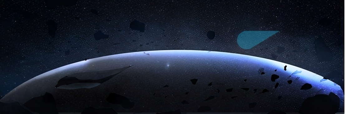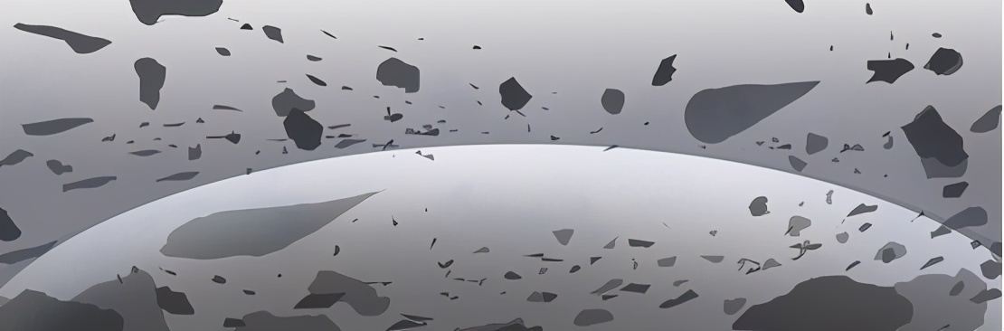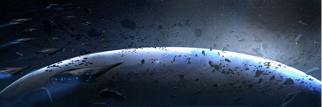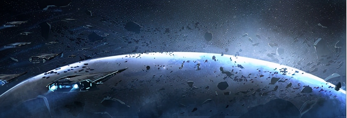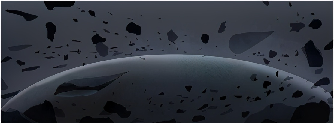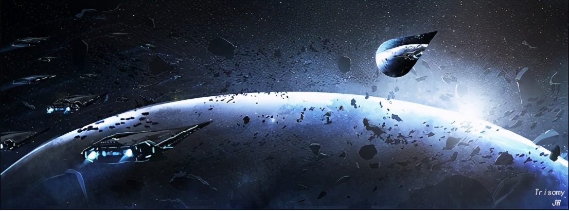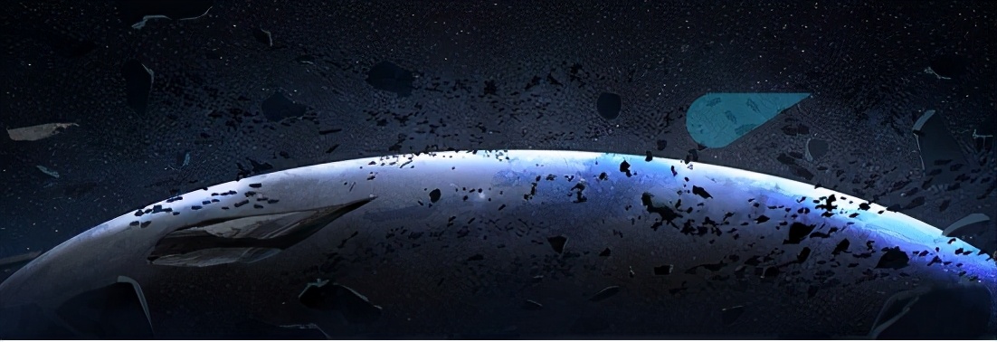 继续为画面添加细节,画出陨石的背光面,飞船的结构以及 动态,添加一些小的元素丰富画面,这里加了一些陨石颗粒以及一些形状不一样的陨石漂浮在太空之中;