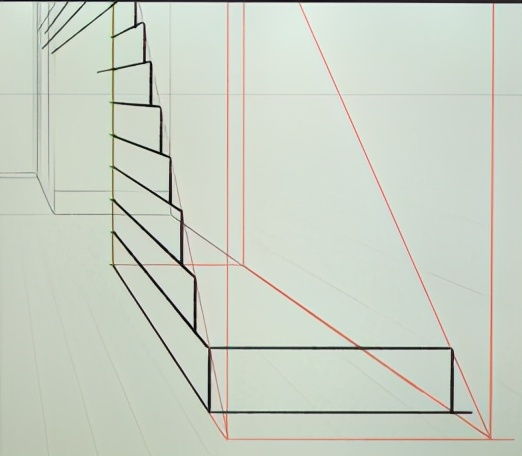 从右侧看,绘制了从与第一阶段的对角线的交点到消失点的对角线(=沿绘制向导的线)。