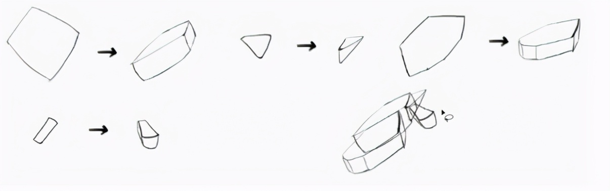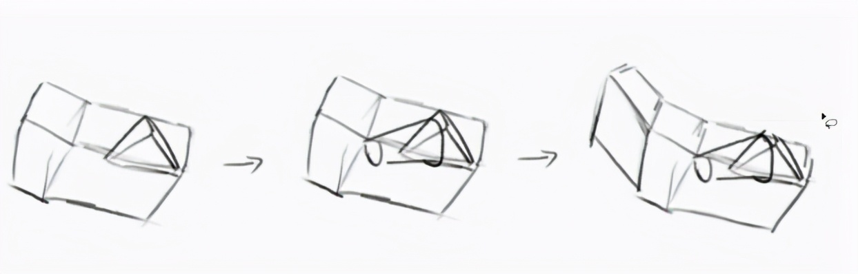 7、换一个姿势画一个手,带点透视画一个长方体作为手掌的块面,然后还是画出大拇指根部,然后画出手指的根部