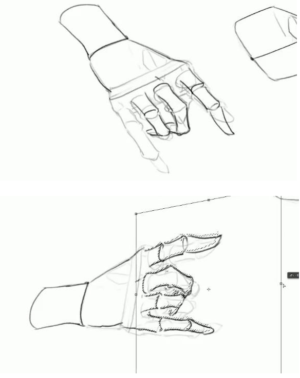 8、接下来画出大拇指,初期不太熟练的时候可以分层画,这样方便修改,然后画手指中间的关节,手背有些厚,可以调整一下。