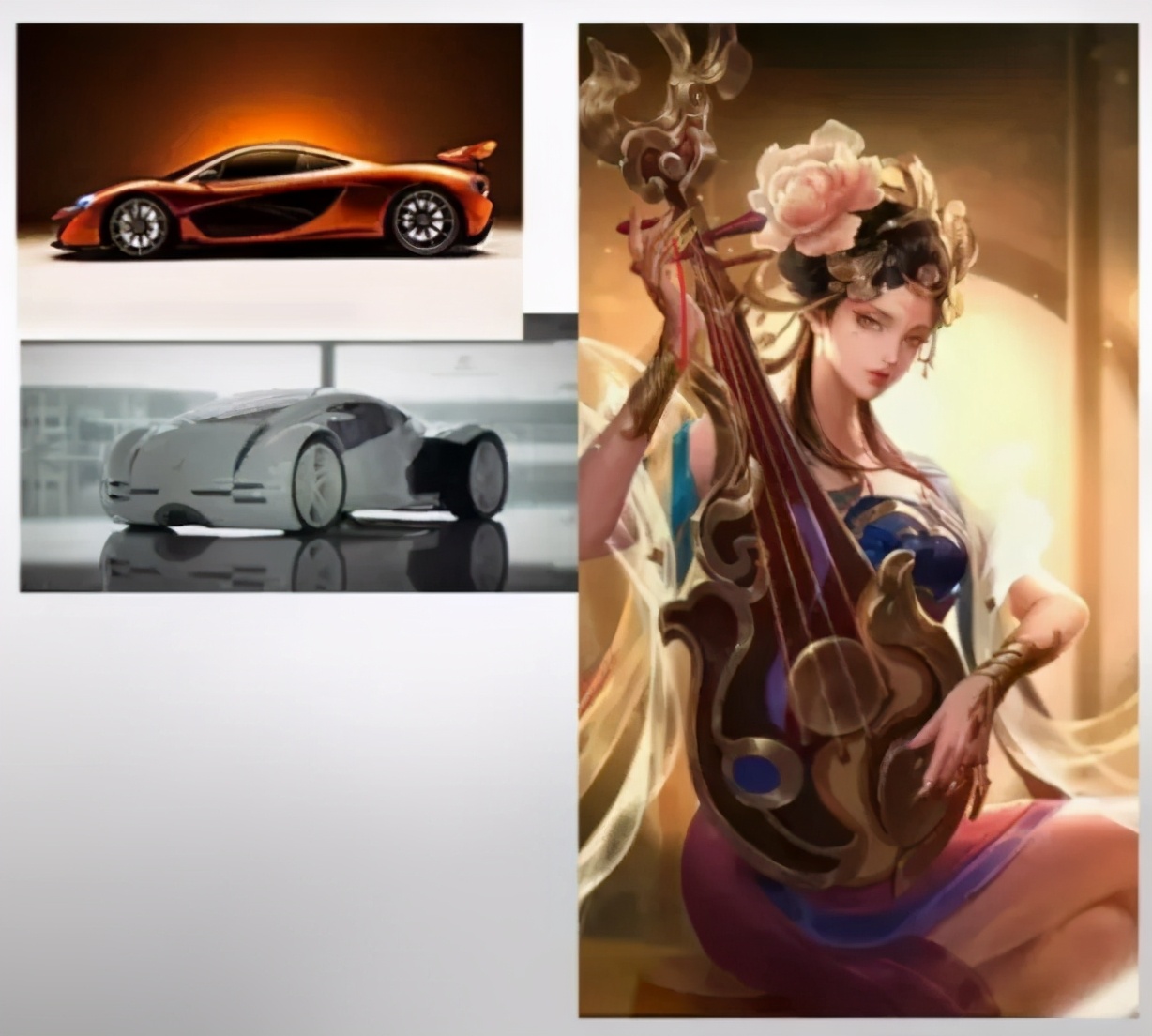 4、S形给人一种华丽的感觉。例如图中的具有运动感的汽车、王者荣耀新出的角色杨玉环,集S形优美、华丽灵巧的特点于一身……