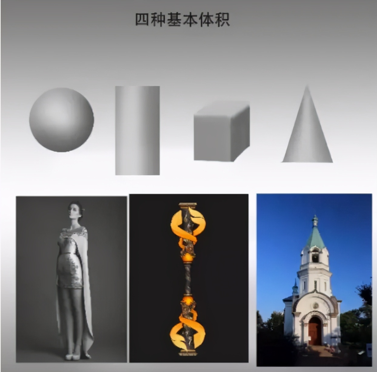 例如,右下角这个建筑我们第一眼看到会觉得非常复杂,但是套用几何体来分析之后,可以发现这个建筑非常简单。首先最上面的十字架是两个方体,然后下面加一个球和一个锥体,下面又是各种各样的方体的组合。