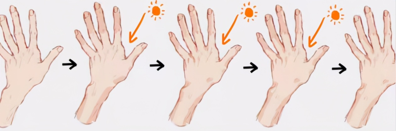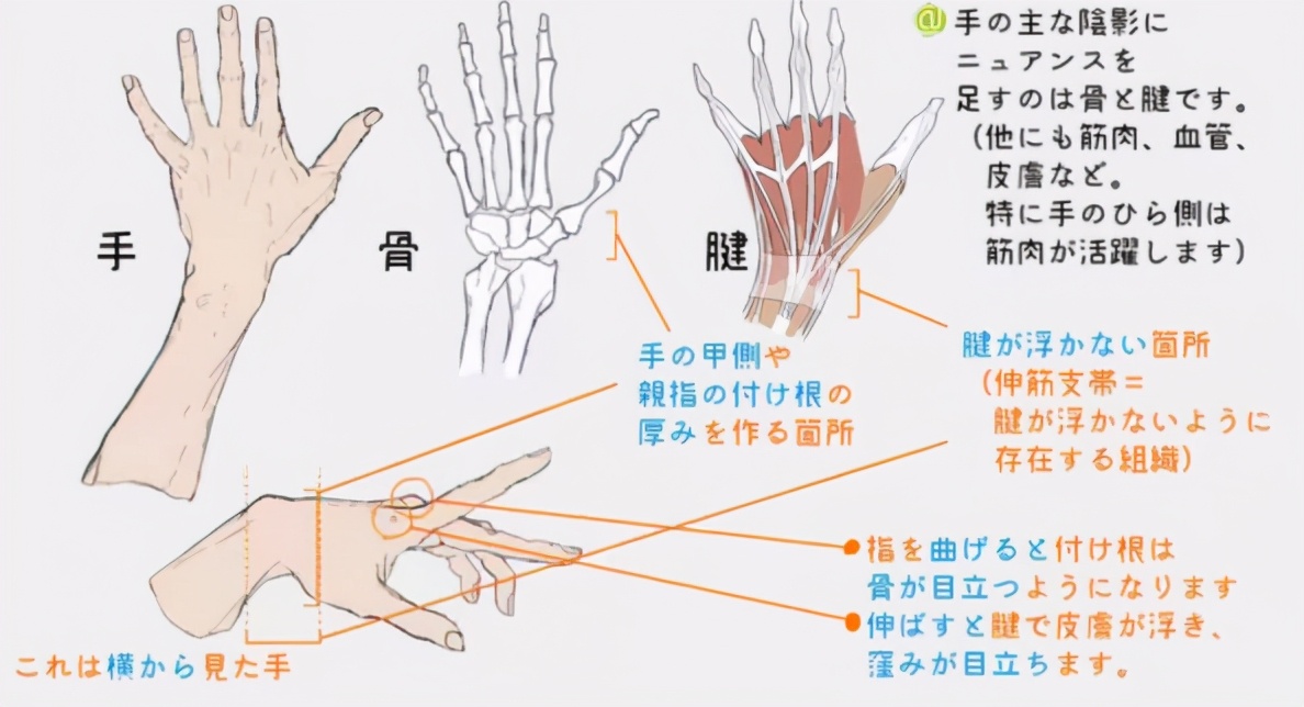给手的主要阴影加上细微差别的是骨头和腱。(其他还有肌肉、血管皮,特别是手掌侧的肉比较活跃)