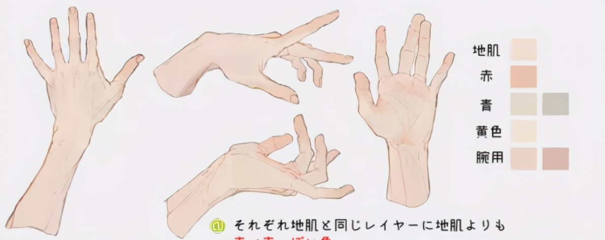 各自的肌肤在同一层中,比起肌肤,试着涂上红色→红色→深绿色、→高光色调的浓淡刷色(手腕是阴影色)。我想仅仅是表现血的循环就可以大大改变印象。