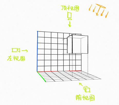 首先线确定墙面(前视图)或者左视图的光线角度影响的投影范围