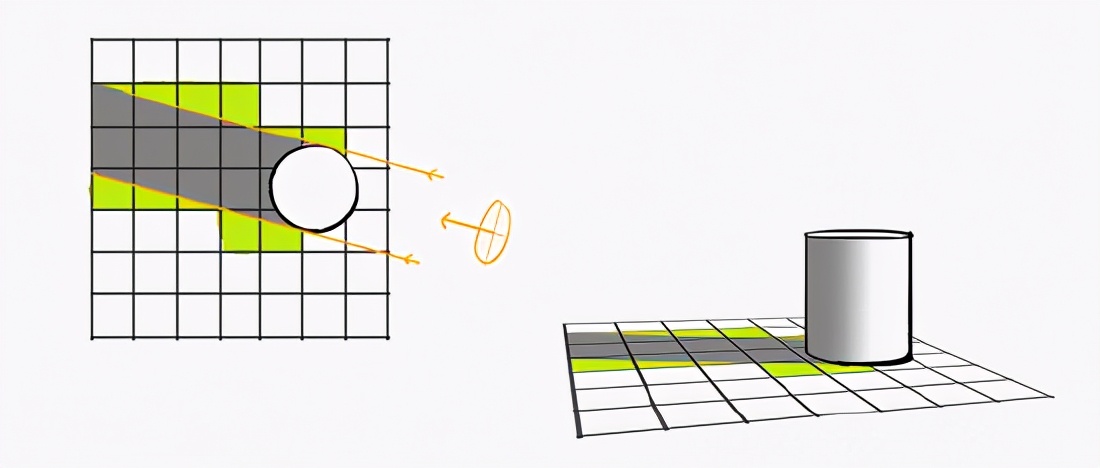 如果一个放在地面的圆柱体,倾斜的平行光影响他会产生的投影会是什么样?