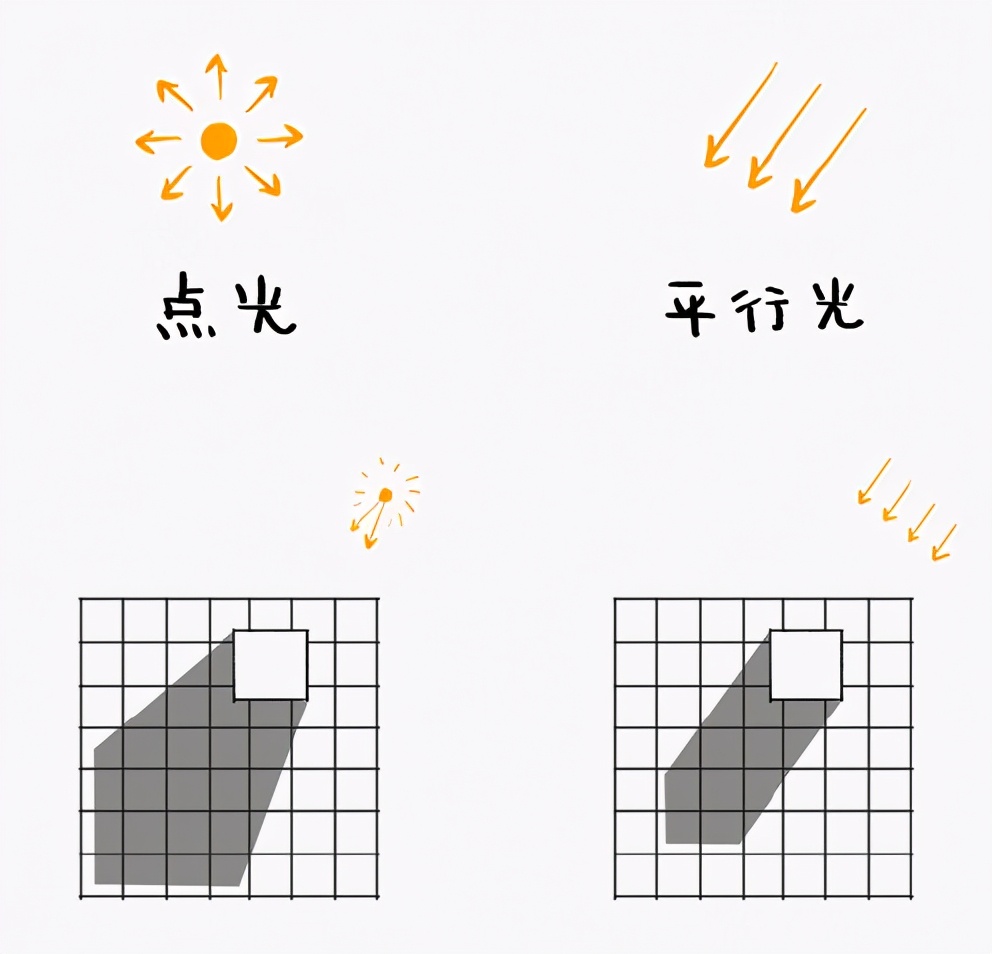 (人照灯光通常都属于点光,太阳光就是平行光)