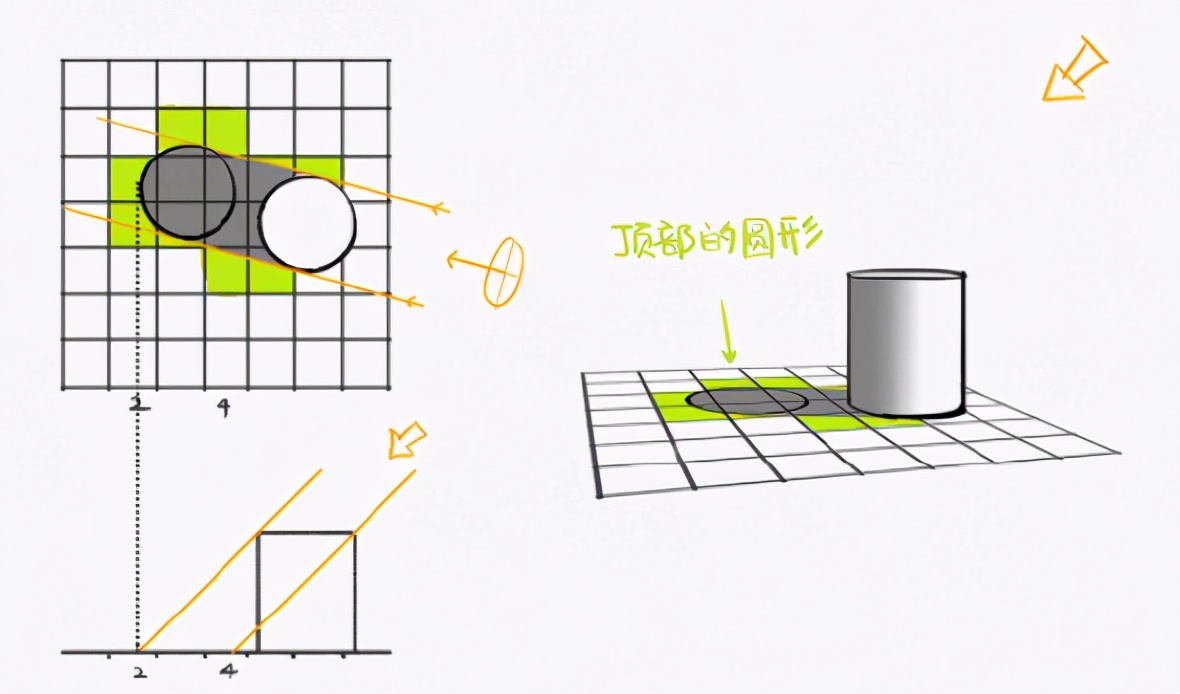 这时候需要多一个立面图的效果来看倾斜的角度,这样就可以很轻松的标记出圆柱体最高处的投影落点(因为是平行光,所以直接平移顶部的圆形即可)