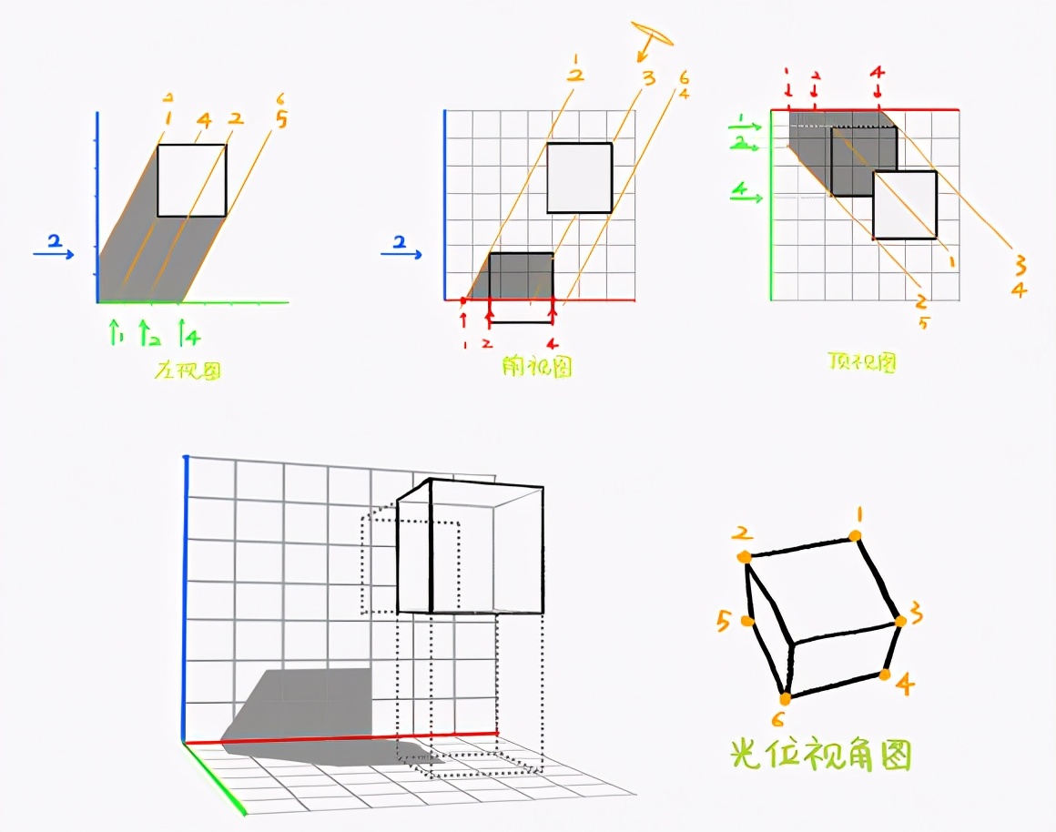 那么按照上面的方法,当你改动光源位置跟角度的时候,一样可以推算不同的投影位置