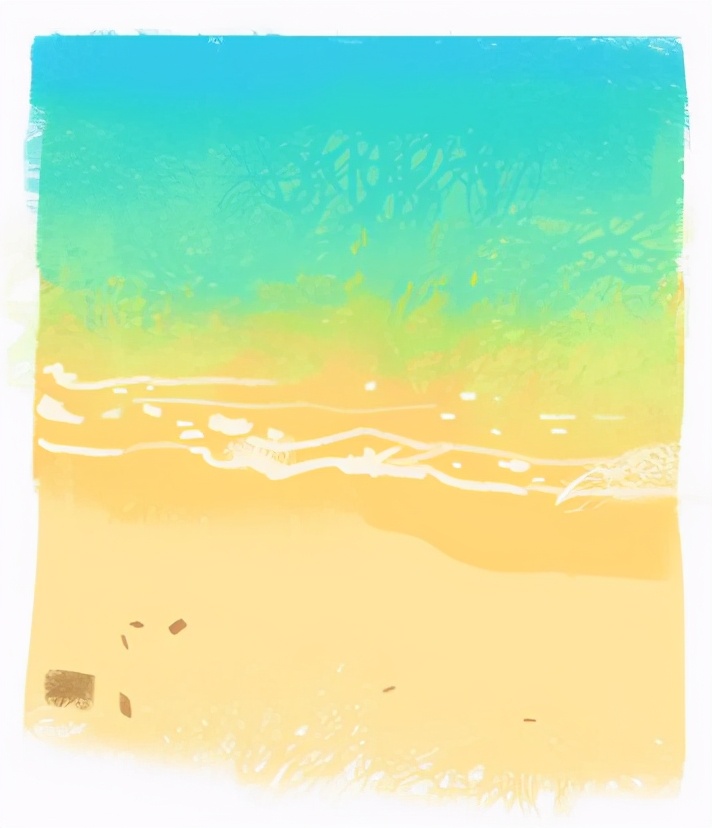 5、这一步远处的水面适当加点蓝色,当然仔细看我在蓝色下面也做了稍微亮一点过渡到青色里面来,然后画出水花,注意水花下方边缘不是和打湿的沙滩边缘一样的位置,更高一点。这样有点像退潮的感觉,显得更自然。沙滩上也可以加点小的深色块表示小石头之类的。