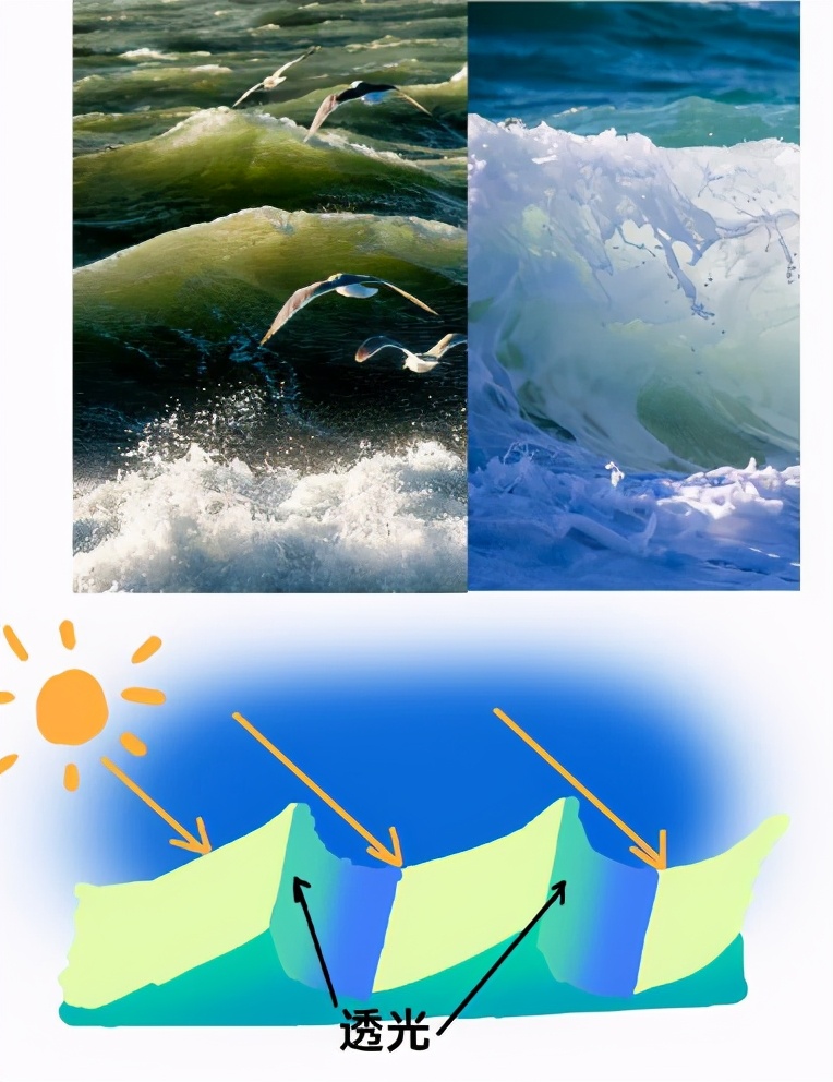 水面的层次丰富,如海浪。水面的高低起伏就像一座座山脉,正是因为这样,造就了会水表面的受光和背光。受光面主要是受阳光照射和受镜面反射天空颜色的影响。当然水面上如果起伏较大时,这时波峰附近相对较薄,阳光更容易穿透。特别是比较浑浊的水质条件下。