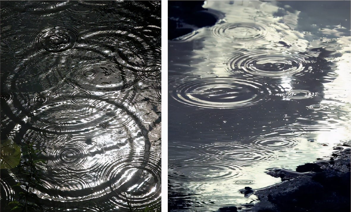 水面的波纹以圆弧形为主。雨水滴在水面上形成很多个不同大小的正圆形状。