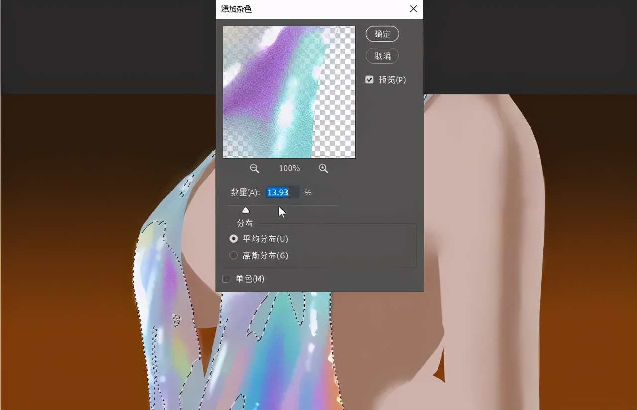 7、套索框选出衣服,使用滤镜,添加杂色,增加噪点,增强质感。