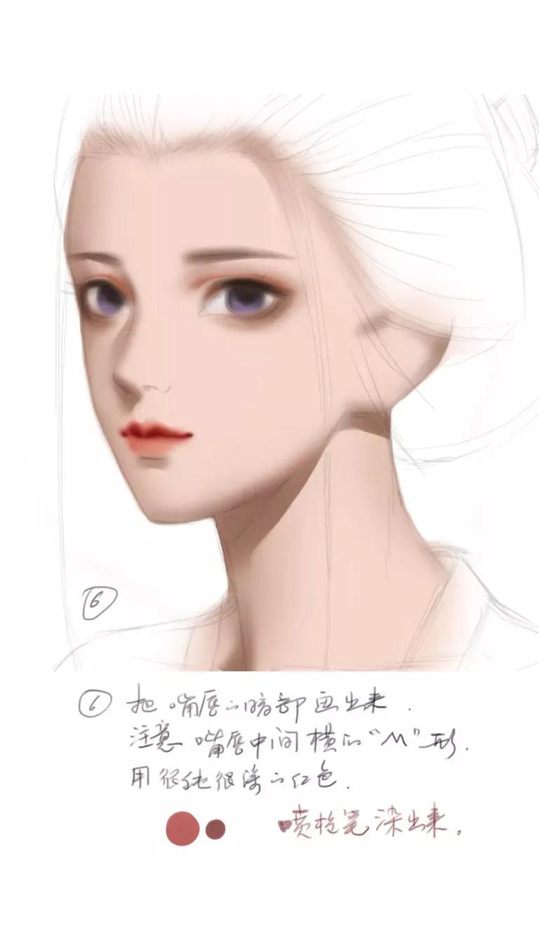 正如老师在图中所说,嘴唇的暗部是要用很深很纯的红色。这一点对于嘴唇的描绘很重要。