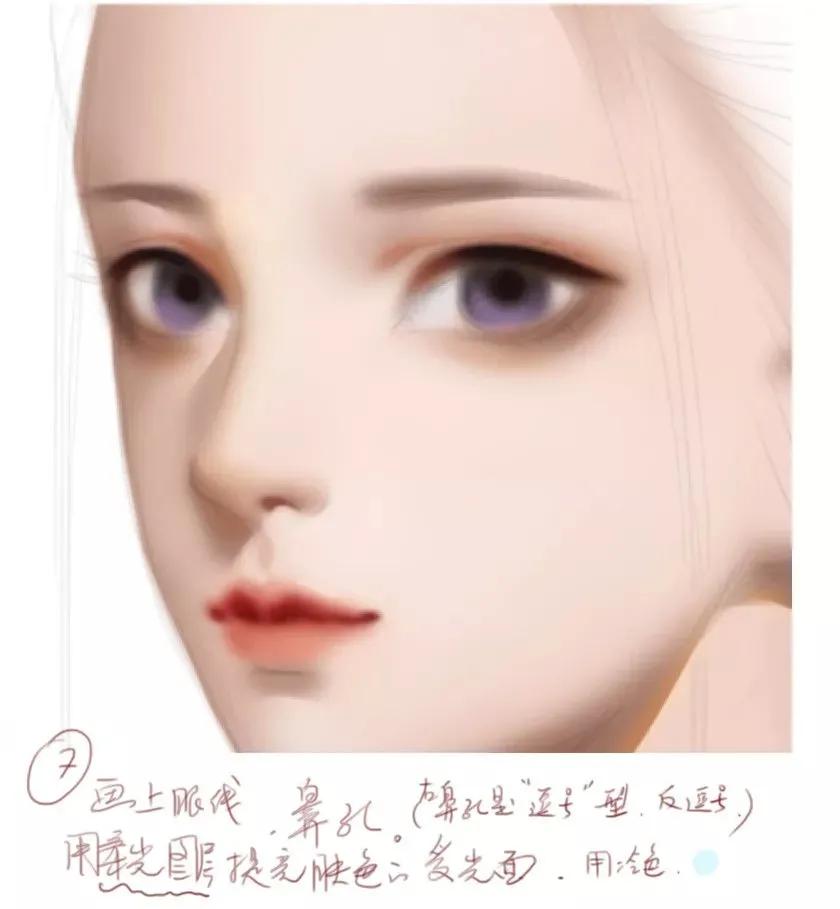 因此这一部在处理五官的时候,可以将一些突出面(比如鼻尖,上眼皮)的位置加些许的亮调。