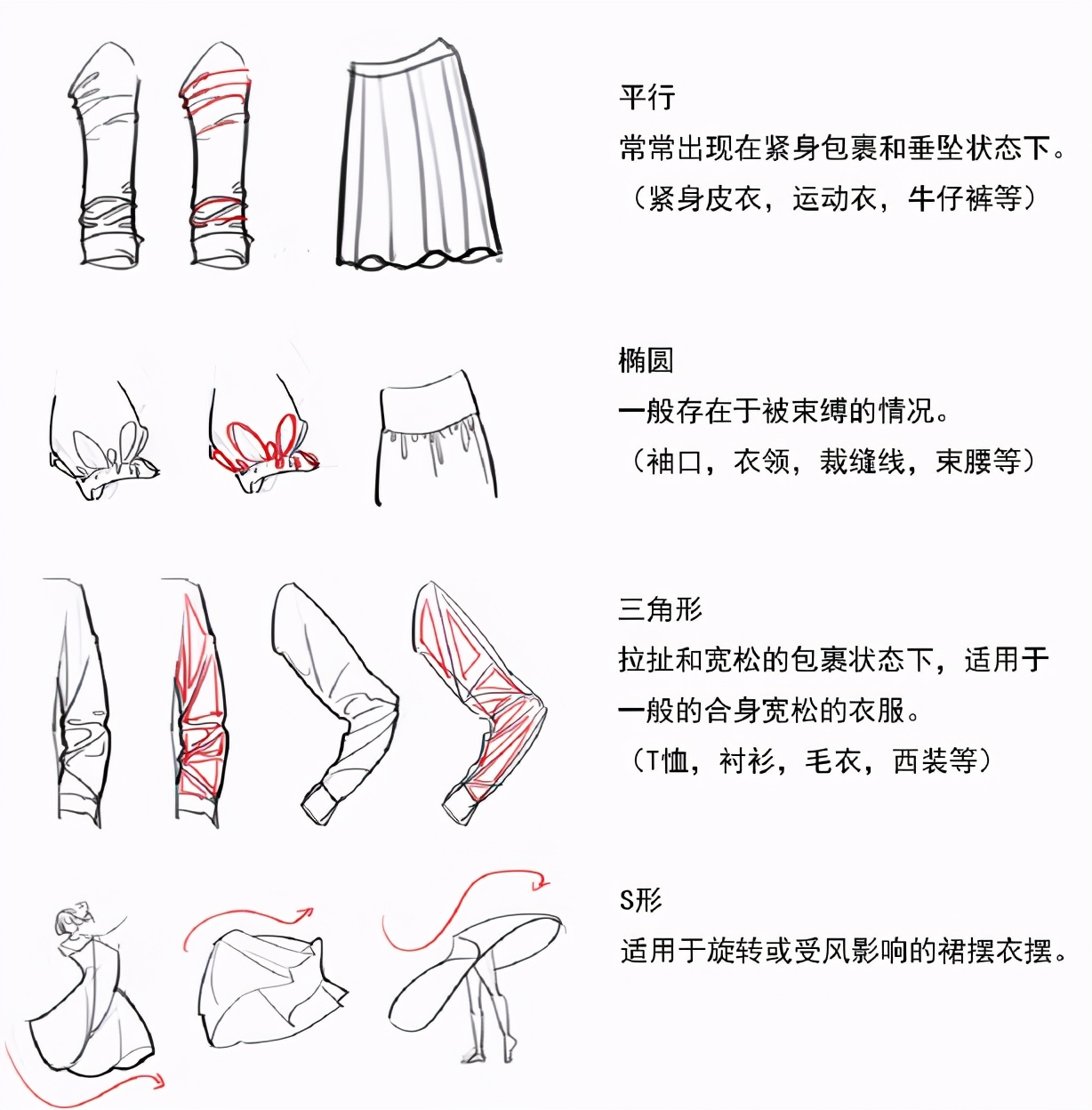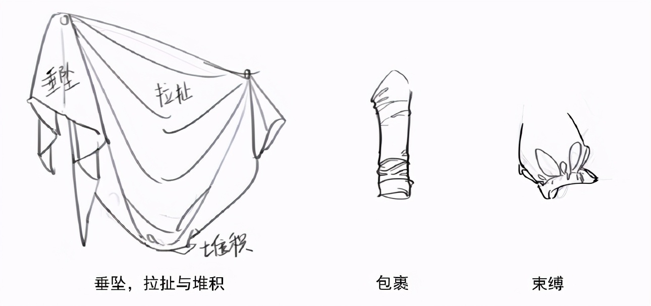 技巧一:衣褶根据受力节点的不同会大概产生的五种形态,垂坠,拉扯,堆积,包裹与束缚。
