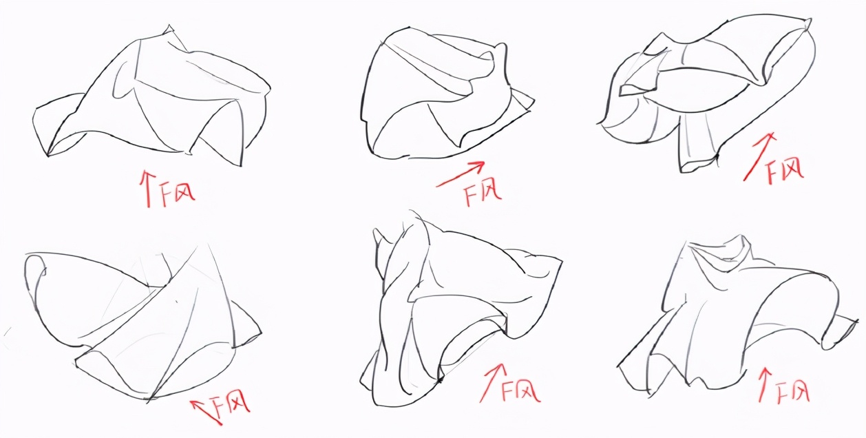 风对衣褶的影响:衣服会随着风吹的方向而发生摆动,常常发生在宽松的上衣,长袍,裙子,披风等情况下,衣褶整体走向以S型为主。