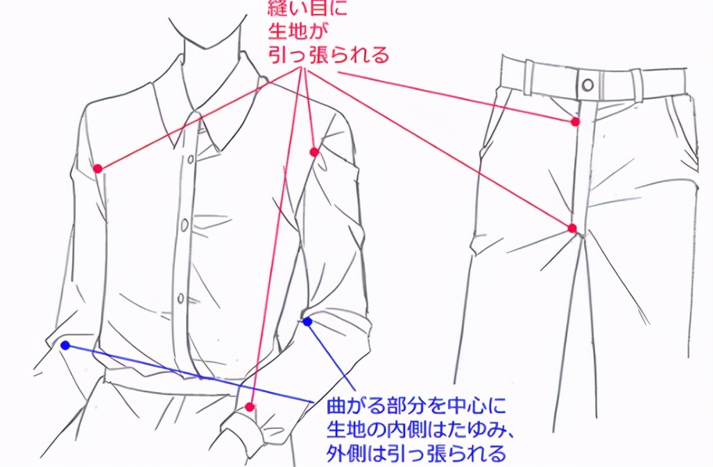 当您穿衣服并移动身体时,布料会在衣服的接缝处被拉扯并产生皱纹。